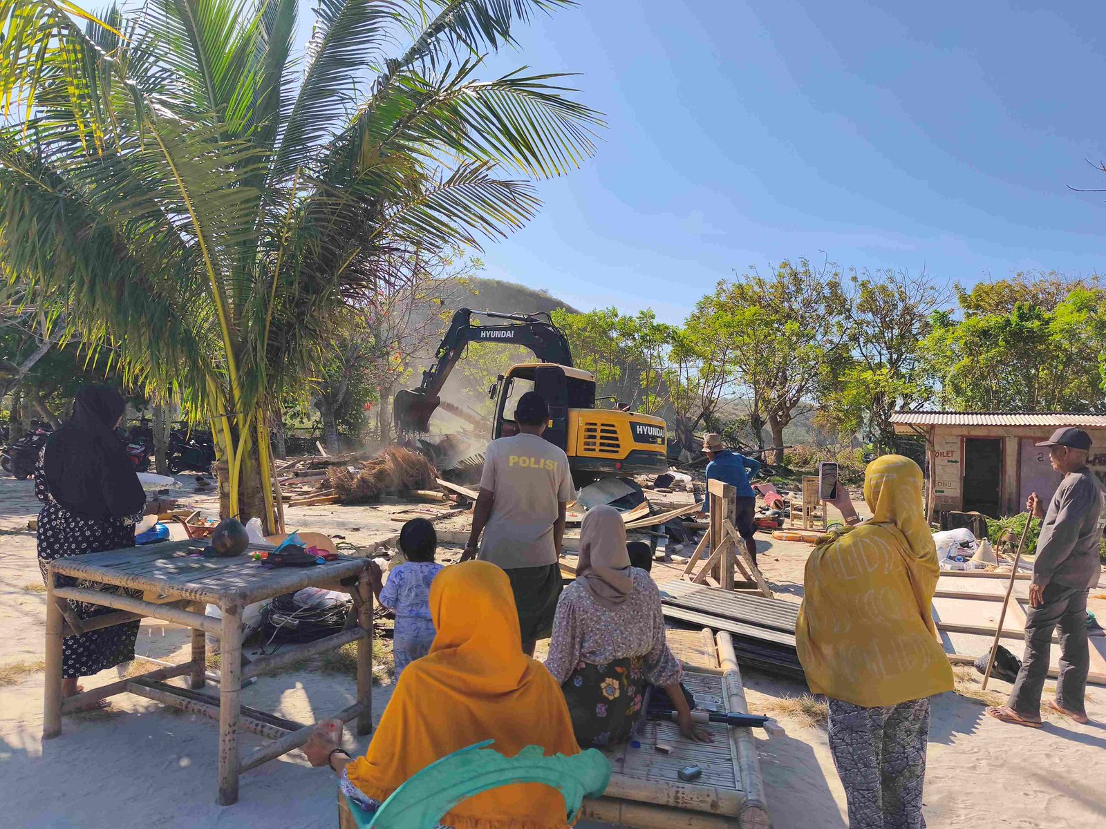 Sementara itu penduduk merasa diperlakukan tidak adil dengan kebijakan Pemda di atas, sehingga penduduk tetap bertahan dan menolak kompensasi sebagaimana ditawarkan oleh Tim Pemda Lombok Barat. Karena penduduk menolak pindah, maka Pemda Lombok Barat melakukan penggusuran atas penginapan dan restoran di lokasi konflik pada 1992. Sekitar 40 bangunan rumah, restoran, kios dan penginapan penduduk dirobohkan. Tindakan penggusuran ini akhirnya meluluhkan semangat sebagian penduduk baik pengusaha bungalow maupun petani. Mereka menerima kompensasi berupa lahan dan sejumlah uang sebagaimana yang ditawarkan oleh Tim Pemda Lombok Barat di atas. Sebelumnya, Pemda melakukan intimidasi terhadap penduduk baik melibatkan Sospol maupun aparat keamanan agar penduduk keluar dari lahan konflik.